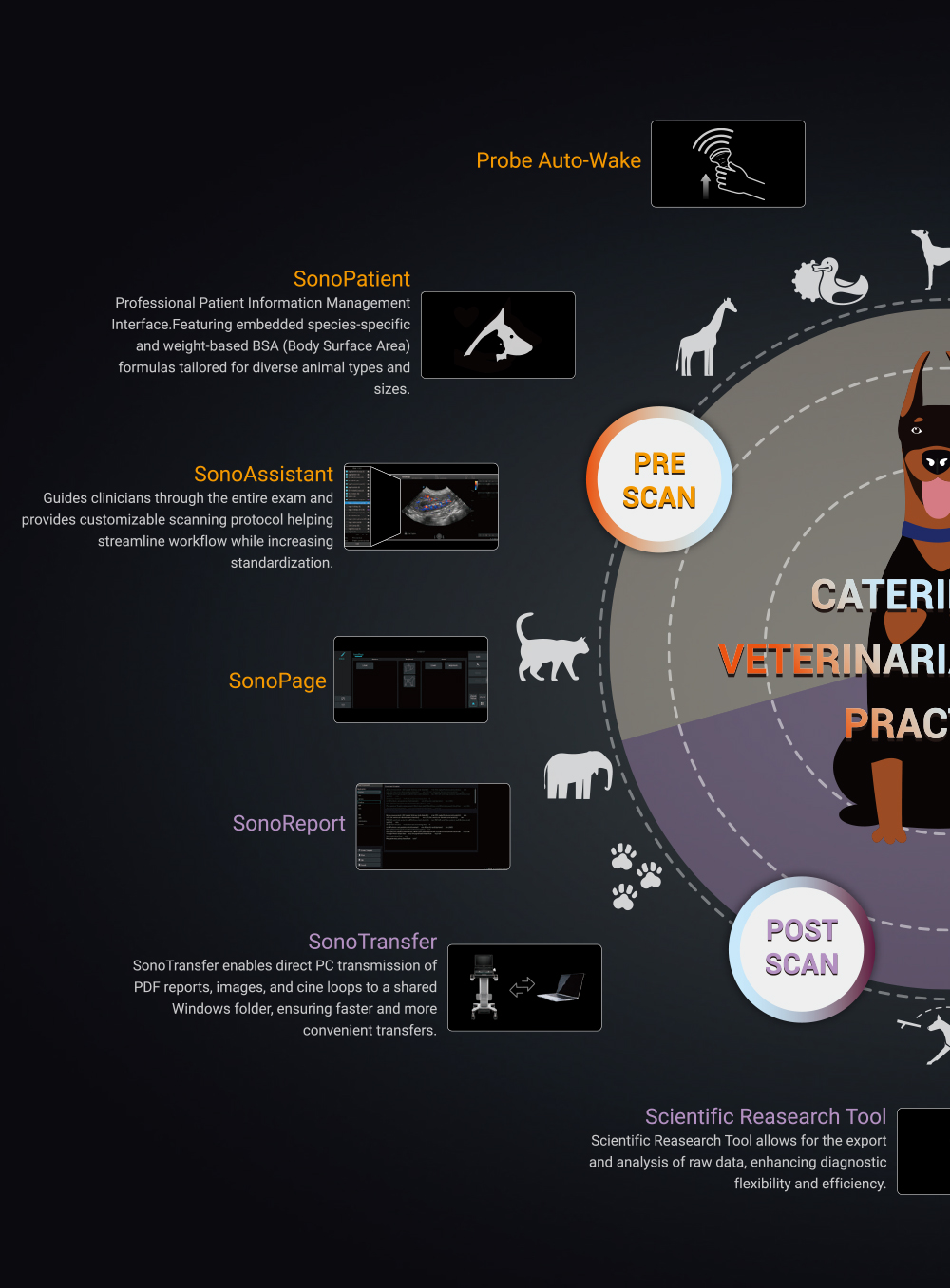 Sonoscape ProPet E11 designed for veterinarians, it delivers unmatched clarity, ultra-fast processing, and seamless adaptability for all species.