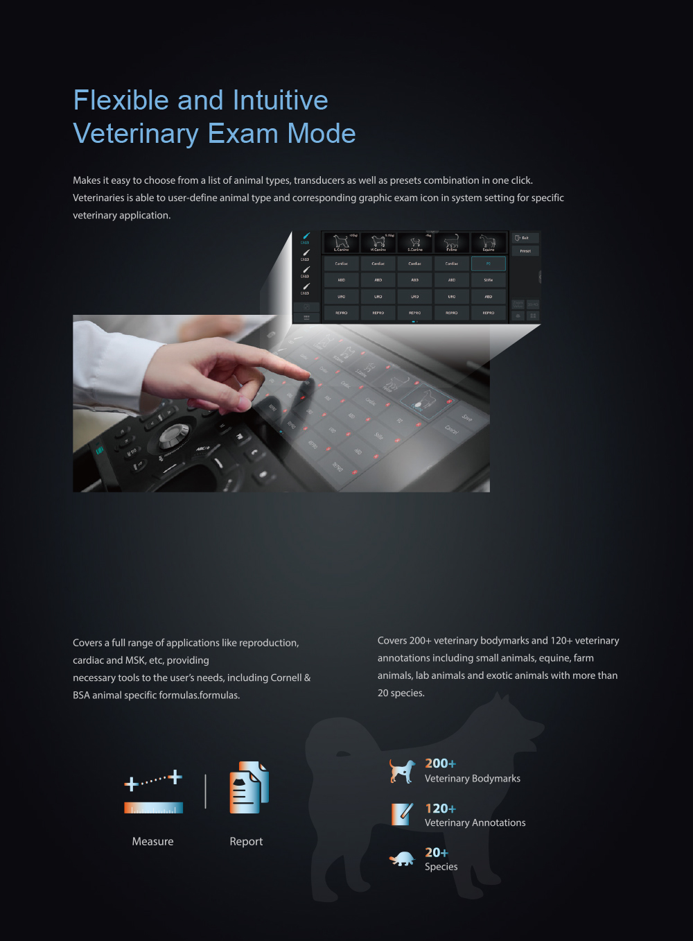 Makes it easy to choose from a list of animal types, transducers as well as presets combination in one click. Veterinaries is able to user-define animal type and corresponding graphic exam icon in system setting for specific veterinary application.