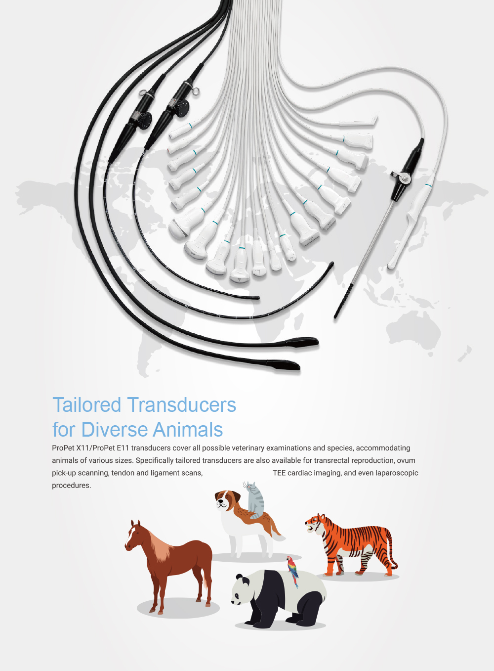 ProPet X11/ProPet E11 transducers cover all possible veterinary examinations and species, accommodating animals of various sizes. Specifically tailored transducers are also available for transrectal reproduction, ovum pick-up scanning, tendon and ligament scans, TEE cardiac imaging, and even laparoscopic procedures.