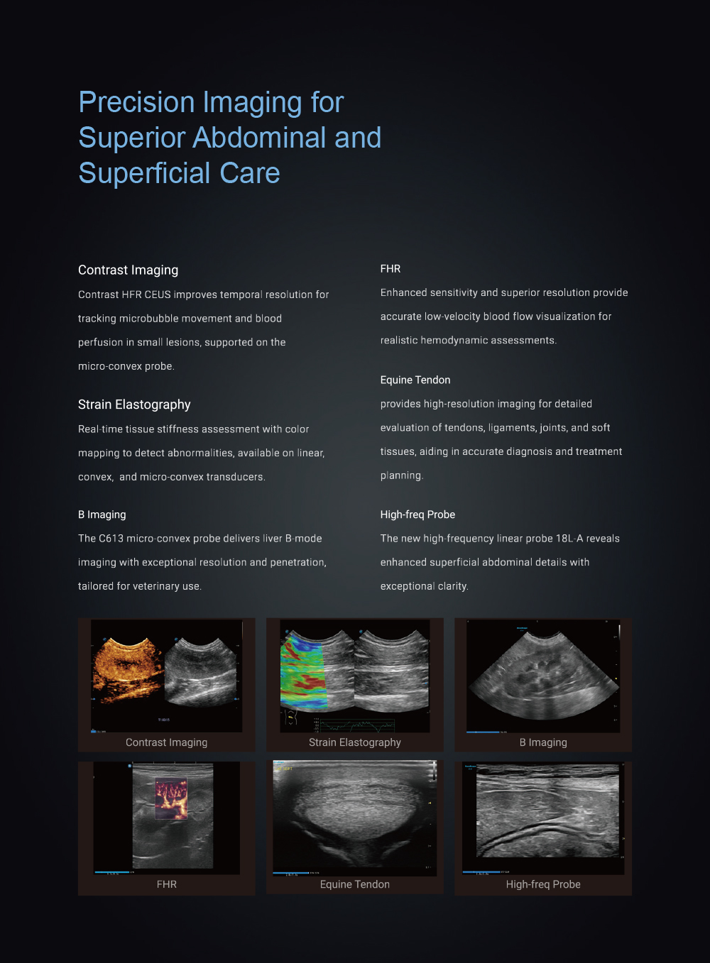 The C613 micro-convex probe delivers liver B-mode imaging with exceptional resolution and penetration, tailored for veterinary use.